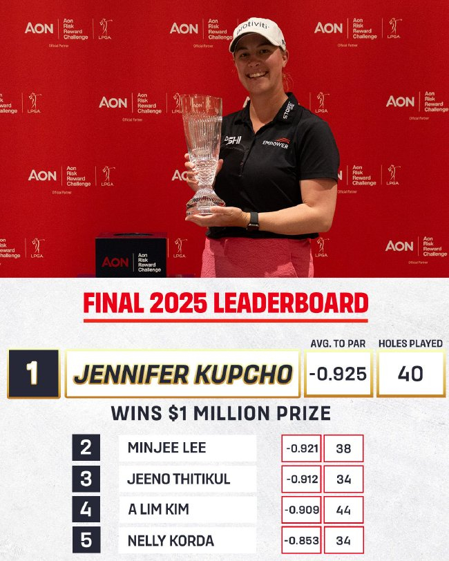 卡普秋赢得了怡安风险回报挑战赛的100万美元奖金。每个指定洞选出最佳两个杆数(低于标准杆)计算成绩。